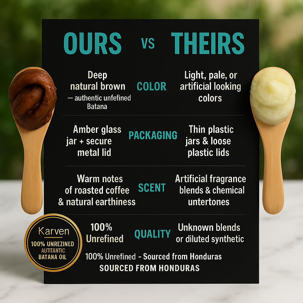Kavern is different — it’s 100% unrefined, authentic Batana oil sourced directly from Honduras, known for its rich nutrients that deeply nourish the scalp and support healthier, fuller-looking hair.